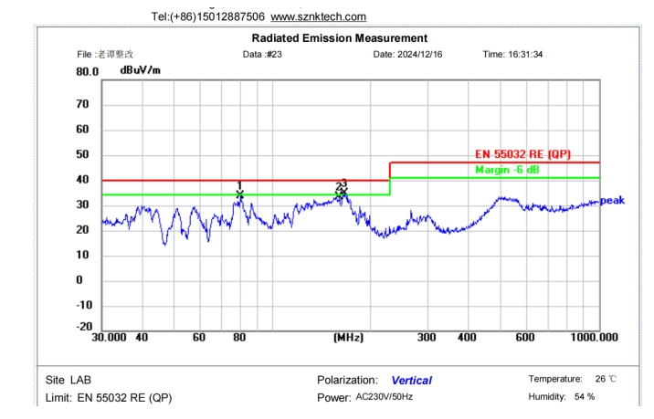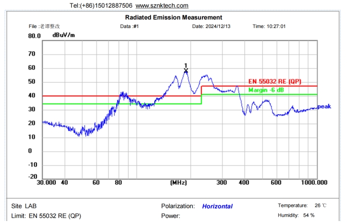 整改前:輻射發(fā)射值在30MHz至1GHz頻段內(nèi)最高超出標(biāo)準(zhǔn)限值10個(gè)多dB。