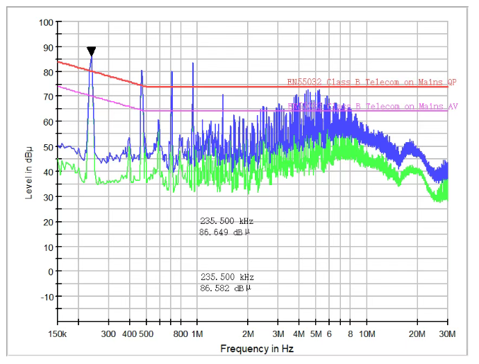 將共模濾波電容C277、C215的容值由4.7nF改為68nF/1kV的電容,修改后的CE測試結果見圖7,可見10M以下的CE噪聲顯著降低,特別是1MHz以下的開關頻率諧波下降更明顯,最小余量也有7.1dB,測試通過。更換的68nF//1kV共模電容的封裝為1210,原4.7nF/2kV共模電容的封裝是1206,電容更改后對PCB布線基本沒有影響。另外,POE接口的浪涌指標為1kV,用68nF//1kV電容也是可以承受的,所以整改方案被接受。
