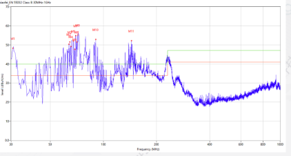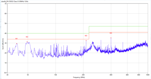 3.定位問題是顯示板與電源驅動板之間的控制數據線數據傳輸導致超標,主要表現為50MHz-200MHz頻段有連續尖峰出現。在控制板數據線靠近連接器增加了納米晶共模電感20uH之后滿足測試余量。