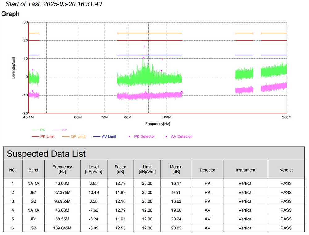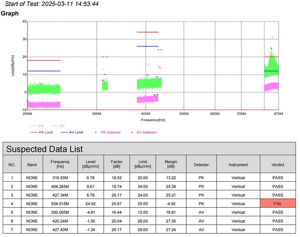 · 二.整改前問題:垂直方向834MHz頻點PK值超標5dB(限值20dBμV/m,實測24.92dBμV/m)